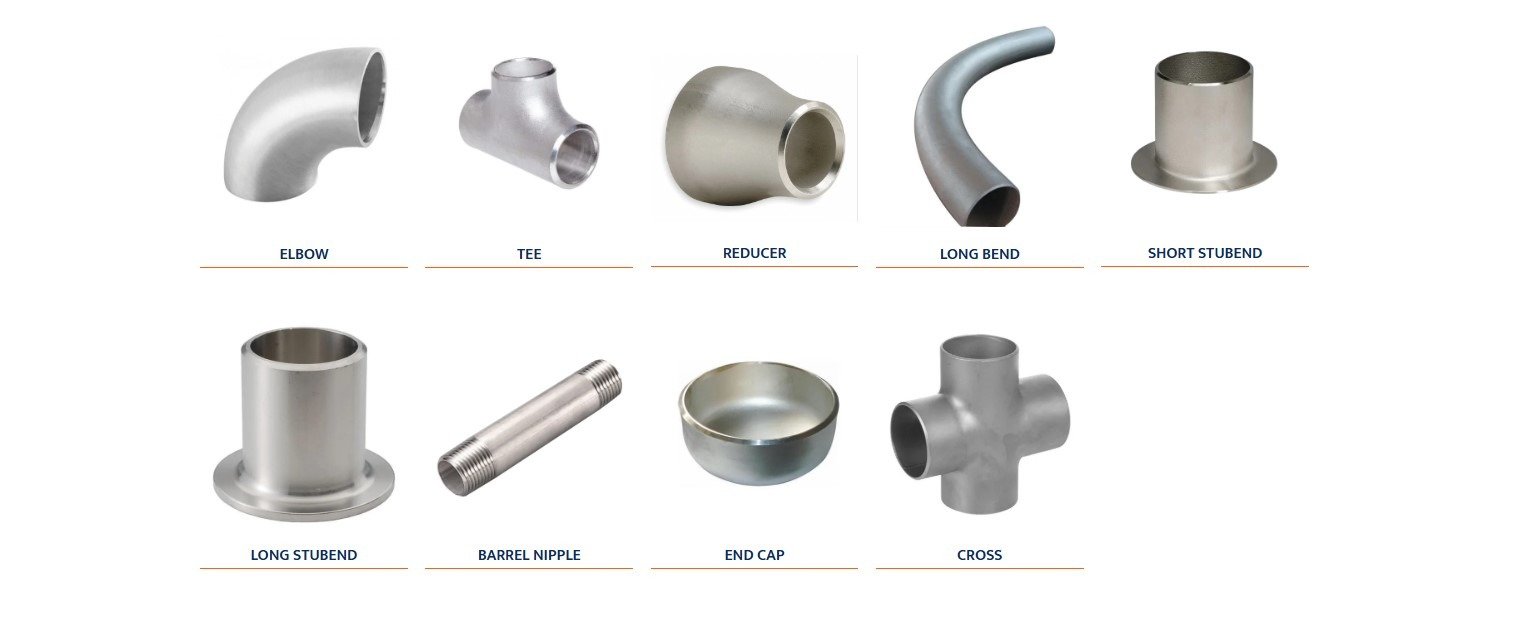 Form Seamless & Welded: – Long Radius & Short Radius Elbow 90° – Long Radius Elbow 45° – Long Radius & Short Radius Elbow 180° (Return Bend) – Reducing Elbow – Equal Tee – Un Equal Tee – Crosses – Concentric Reducer – Eccentric Reducer – Long Stubend – Short Stubend – Coller – Pipe Cap – Long Radius Bends (R = 3D, 5D, 6D, 8D, 10D, 20D) in 15°, 30°, 60°, 90° – Drawing Based Customised Butt Weld Fittings